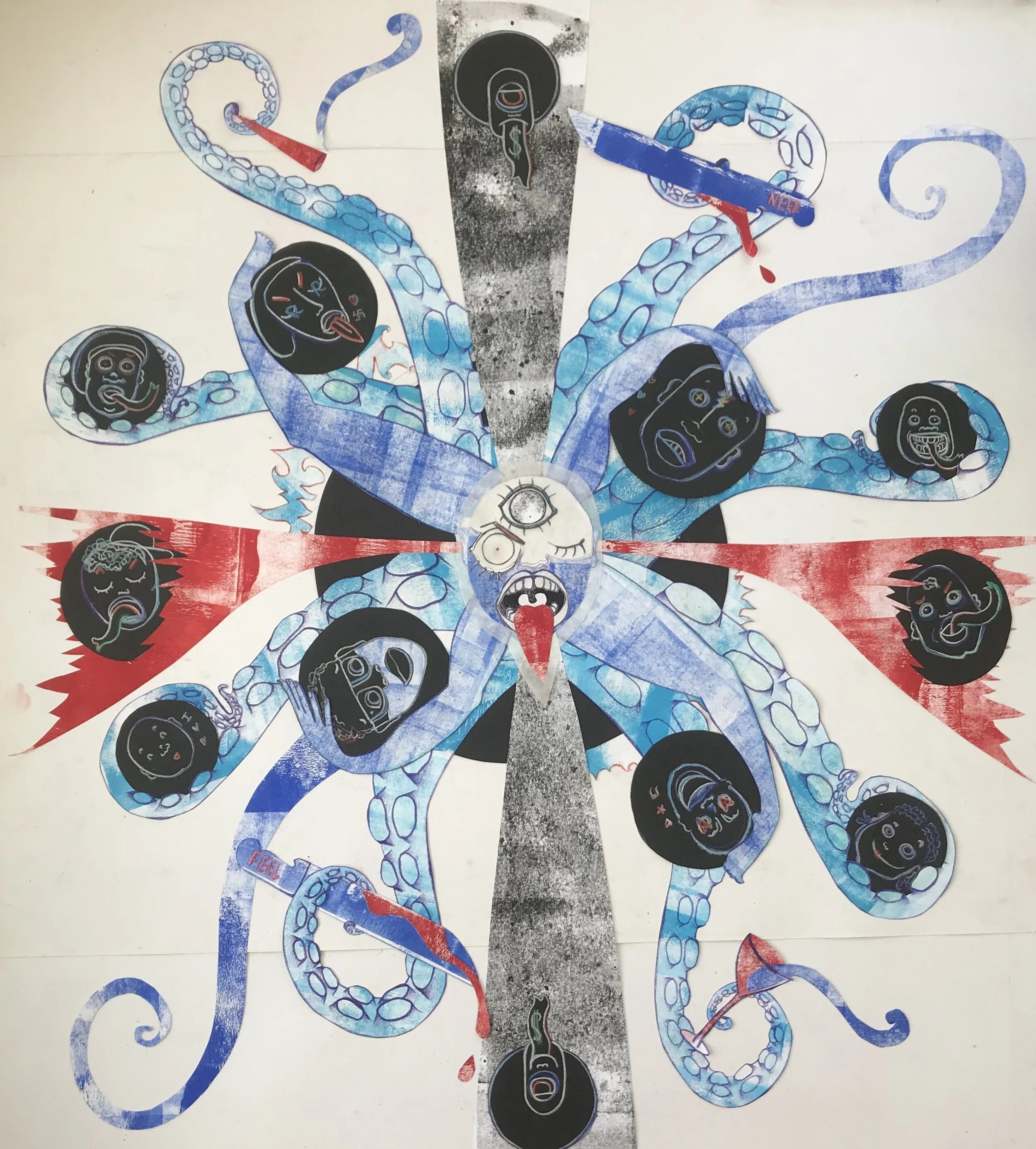 My art piece is a familiar constellation of the relationships that kept me going before and after Covid, most of whom were far from being love. The main theme of my art piece is how toxicity feeds toxicity, how it is all a circle, how i became a vengeful Demon, similar to Kali, by not acknowledging my humanity. As other character in the piece, I couldnt recognize my need for deep connections, and as I felt betrayed by the only one I made in three years on the island, my rage was blind. Eventually i was able to stop and heal instead of harming others. I was able to do so thanks to deep connections I had abroad (for example the only character that looks at me, he is my moon in my familiar constellation and its been an important "safe space" as he could see me for who i am, he made me felt valid, beyond appearances... this is what love is). The toxicity of the environment on the island of Antigua is rooted in its history and it is everywhere, most of the characters in my familiar constellation tried to manipulate and abuse me as a coping mechanism, I kept track of myself because i've been given the tools to read my needs and feelings. This doesnt make me a better person than the other one in the piece, this makes me able to facilitate them in their personal realization path, which is nothing but developing the tools to read their needs&feelings and being able to communicate them properly . Everyone has to thrive in order for the system itself to thrive, every display of hate is only an unexpressed need to feel valid. Seeking validation in coping mechanism such as substance abuse, religion, by bending reality or abusing others will only keep the toxic cycle going. Everyone deserves consistent love in facts, empty statements are not enough.